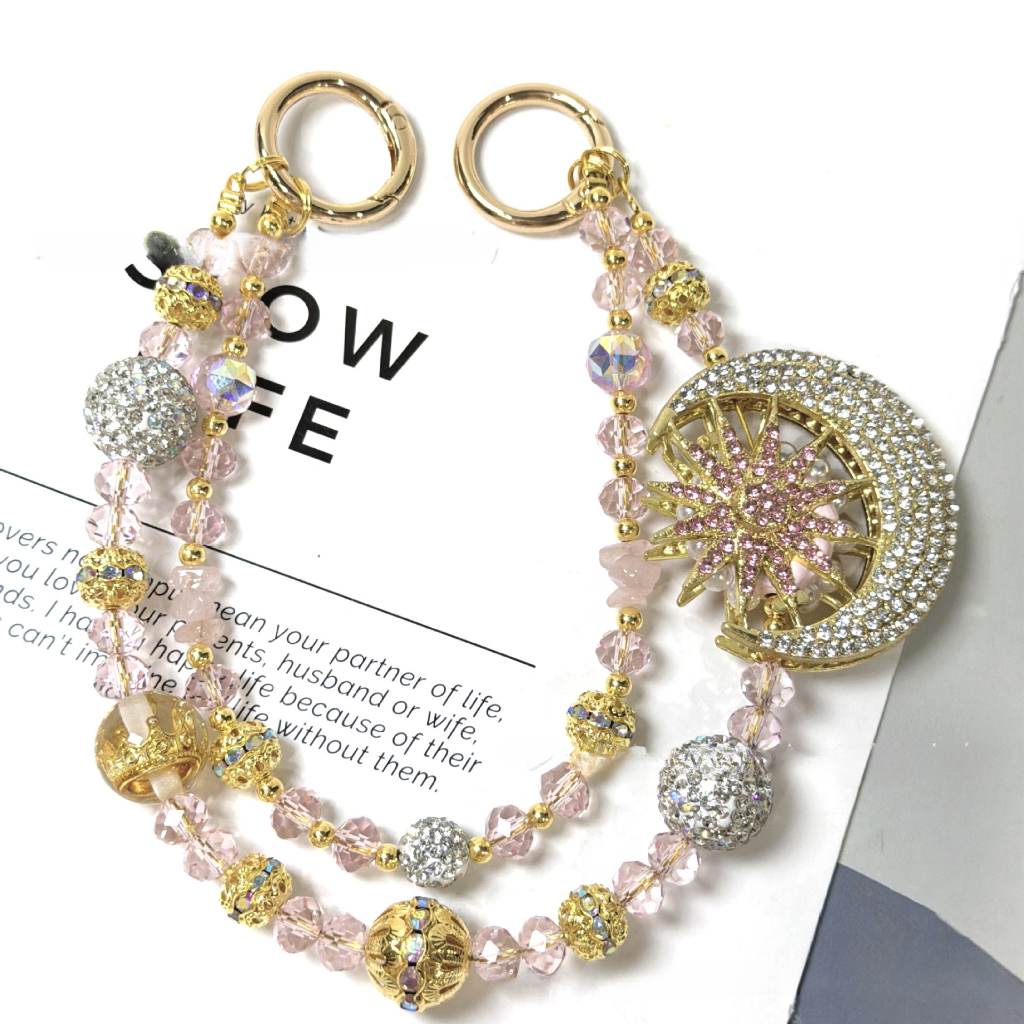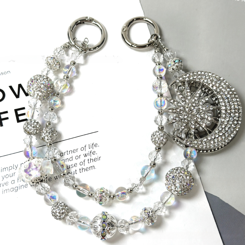✨ A luxe double-layer beaded bag chain featuring a sparkling crescent moon charm with star details, finished with crystal beads and a sleek shine.